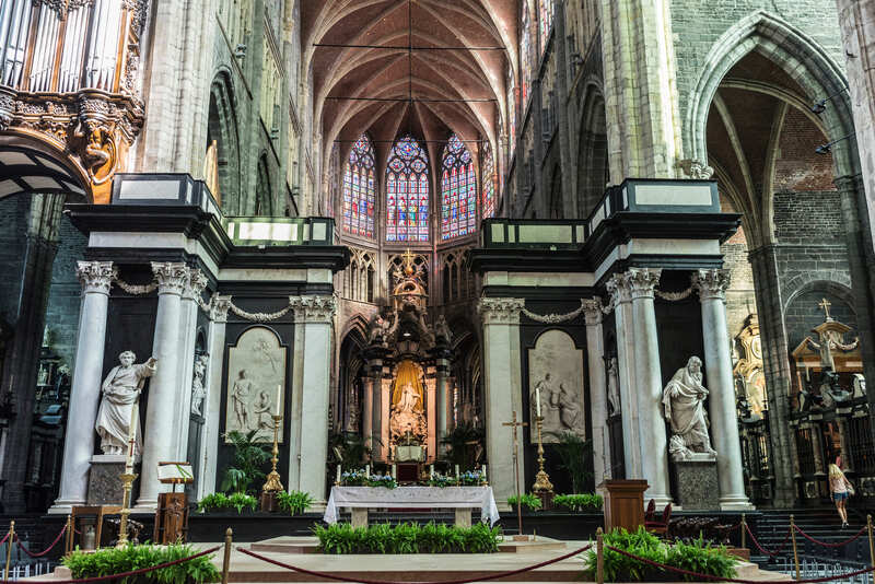 Proseguendo verso il cuore monumentale della città si incontra la Cattedrale di San Bavone. Qui è custodito uno dei dipinti più importanti della storia dell’arte europea: il Polittico dell’Agnello Mistico dei fratelli Van Eyck. L’opera colpisce per precisione tecnica, profondità simbolica e importanza storica.
